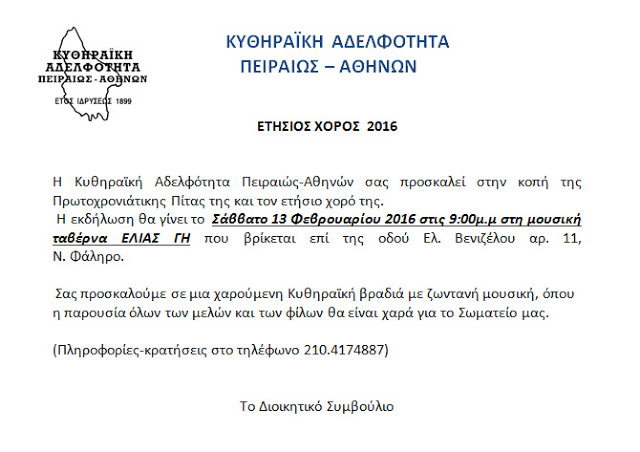 ΕΤΗΣΙΟΣ ΧΟΡΟΣ ΚΥΘΗΡΑΪΚΗΣ ΑΔΕΛΦΟΤΗΤΟΣ 2016